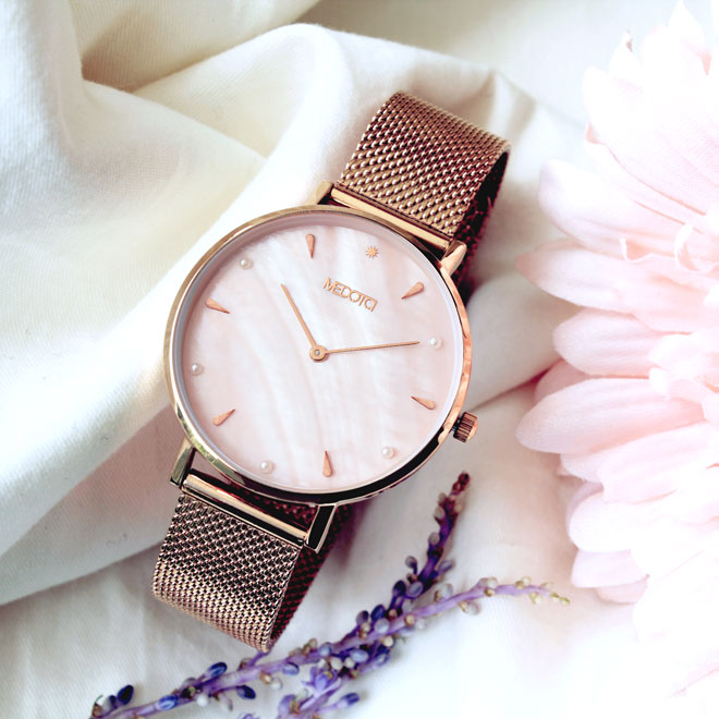 Design ideal of THETIS collection is from the ocean, the surface is made from shell and used beautiful pearl embellish watch. Case and strap is stainless steel.