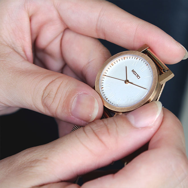 Design of Minimalism, under the elegant clean surface and dent's Roman numerals and meticulous production process into a stainless steel case with a pointer and convey the meaning of original and simple.